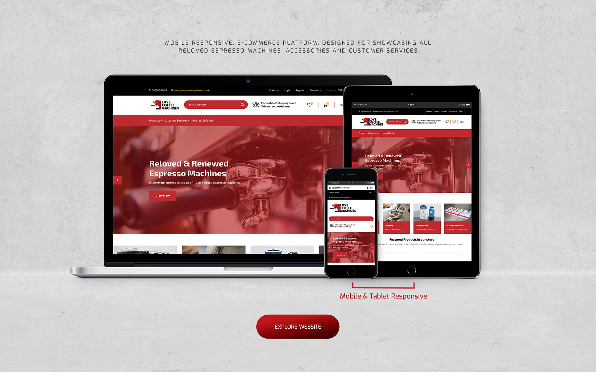 Love Coffee Machines specialise in supplying quality, used espresso machines - creating failsafe equipment from old. The new identity needed to embody this, as well as being strong, bold and simple. I started by reducing the identity to its simplest form and then shaping it into a logo that would be distinct and easy to recognise. The look and feel uses a bold red as its primary motif, braced by textures and tones echoing the workshops where these machines are renewed.